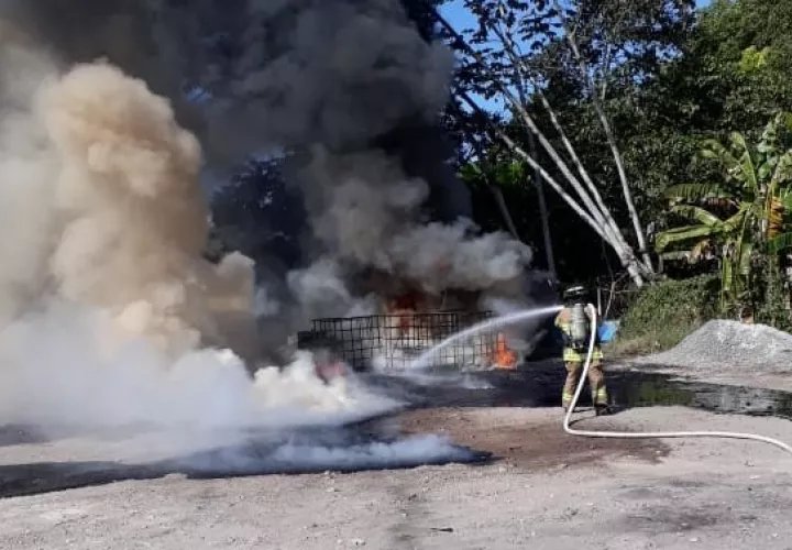 Un vehículo que se incendió y las llamas alcanzaron unos tanques que contenían alquitrán en el sector de Chilibre de El Roble, provincia de Coclé, a la altura de la vía Panamericana.