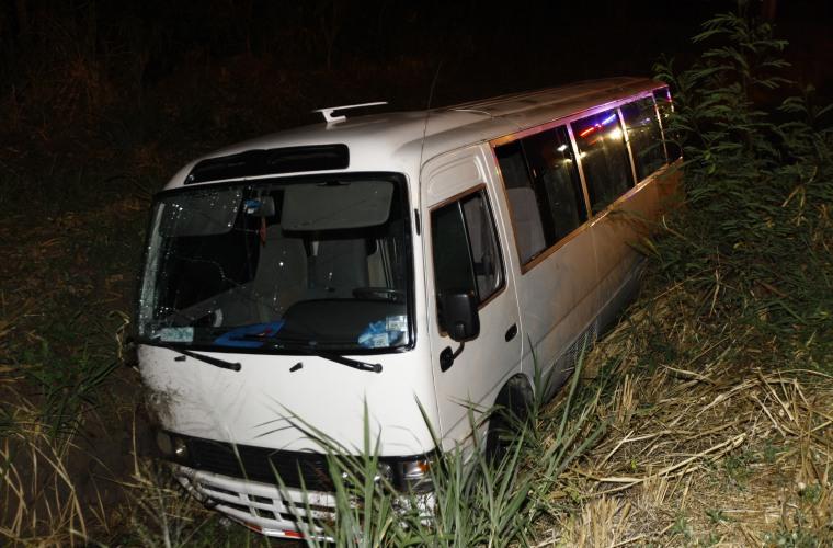 El conductor de un busito pirata de la ruta Pedregal-5 de mayo cayó en una cuneta próximo a la entrada de Rodman, Arraiján, la noche del jueves. Recibió golpes leves. Fue llevado al HST, por los bomberos.