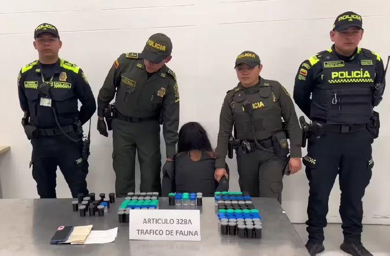 La Policía Metropolitana de Bogotá capturó a una brasileña que pretendía sacar del país 130 ejemplares de la rana arlequín venenosa, una de las más mortales del mundo y que se encuentra en vía de extinción.