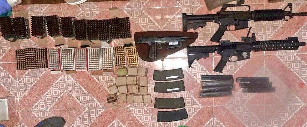 Mediante una diligencia de allanamiento se le decomisó a la mujer en una residencia unas 2 armas de guerra, una subametralladora, 1,127 municiones de fusil, 500 municiones de pistola y un paquete que se presume sea droga.