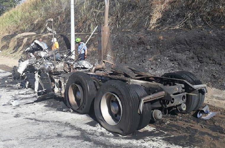 El cabezal de un camión resultó totalmente destruido, luego de ser consumido por un voraz fuego la tarde de ayer lunes en el tramo del Corredor Norte, a la altura de Brisas del Golf, del corregimiento Rufina Alfaro, en el distrito San Miguelito.
