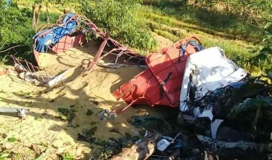 Camión articulado cargado de arroz queda destruido al caer a precipicio