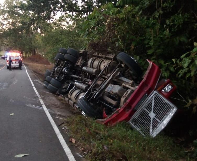 Un camión repleto de arroz en cáscara se volcó la mañana de este martes en la carretera nacional Soná-Puerto Vidal, en el distrito de Las Palmas de Veraguas.
