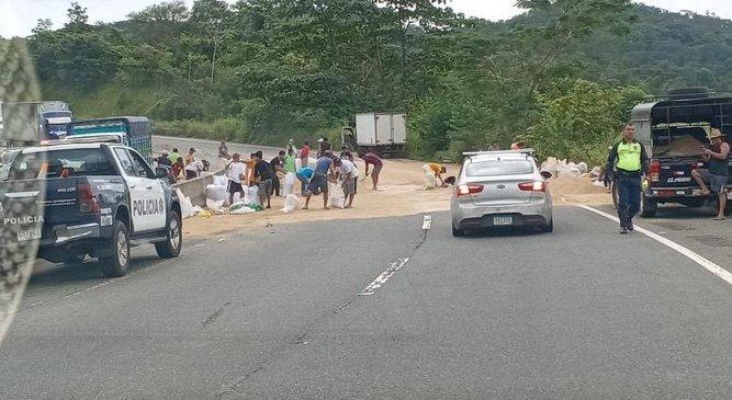 Camión cargado de arroz se vuelca en vía. Vecinos lo recogen