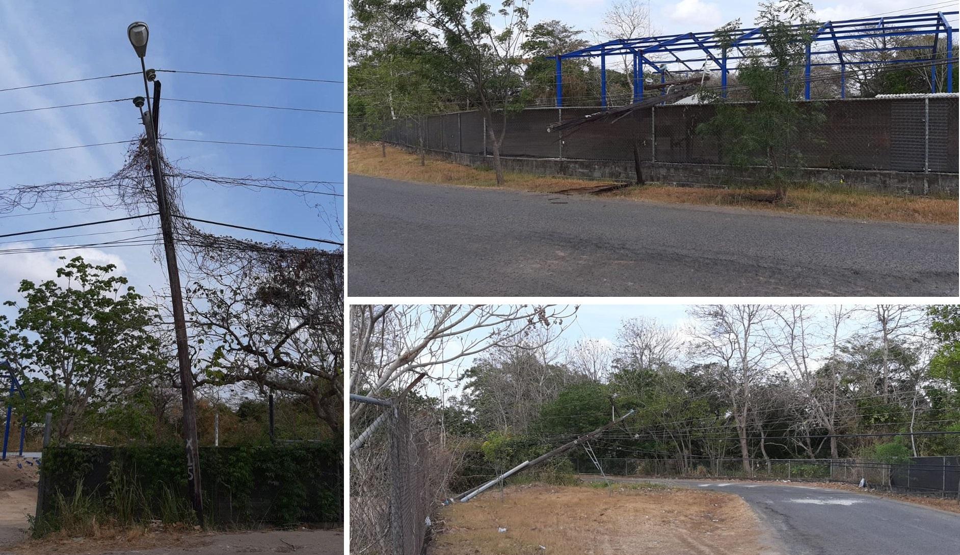 Producto del accidente de tránsito uno de los postes de madera terminó completamente partido, lo que ocasionó que la parte que sostiene el cableado que conduce la energía eléctrica no se rompiera gracias a que quedó sobre una cerca de alambre ciclón.