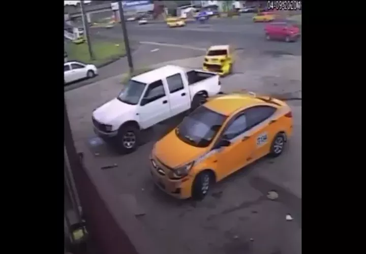 La cámara de un sistema de videovigilancia captó el momento justo en el que un sedán de color rojo y un taxi colisionan de manera violenta en una intersección de una vía en Cativá, provincia de Colón.