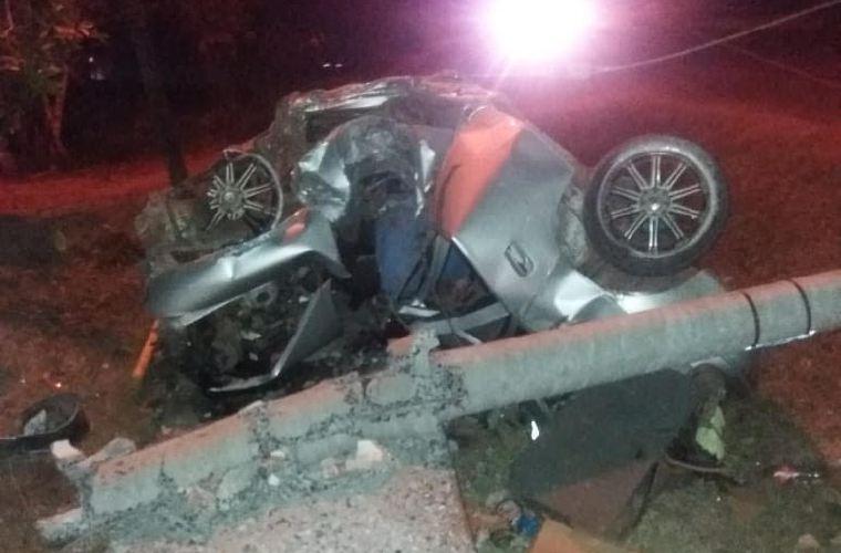 El fuerte impacto provocó que el poste cayera por completo encima del vehículo que quedó casi en pedazos y dejó al conductor atrapado entre los hierros retorcidos.
