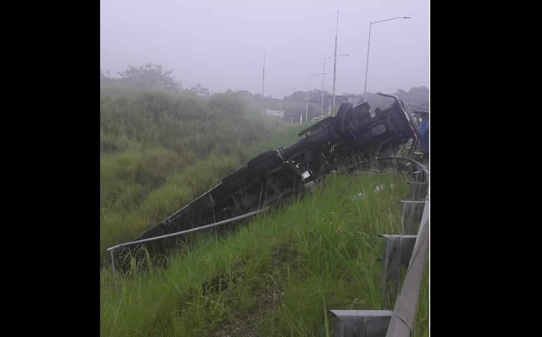 Panamá - Un camión cisterna se accidentó la mañana de este jueves en la autopista Panamá - Colón, a la atura de Quebrada López, en Colón.