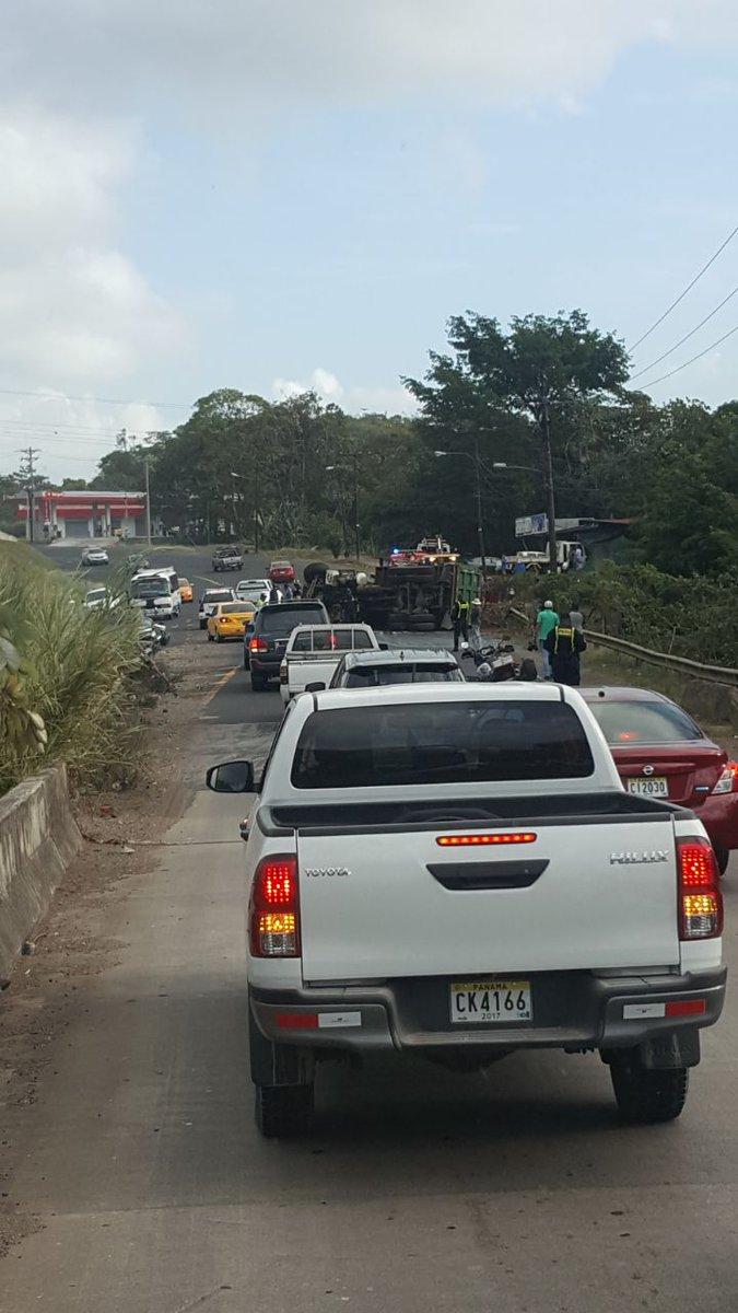 Con fuerte golpes resultó el conductor de un camión volquete al quedar volteado cerca a la entrada de la Autopista Panamá-Colón, a la altura de Sabanitas.