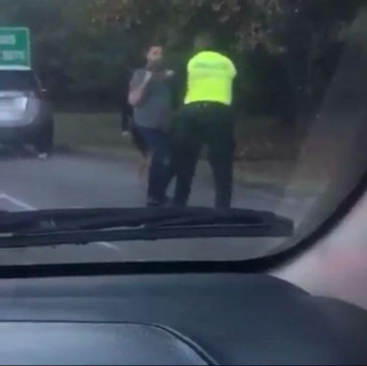 Una dama, que aparentemente es la acompañante del conductor, interviene, le dice algo, al parecer trata de convencerlo para que regrese a su vehículo y lo logra.