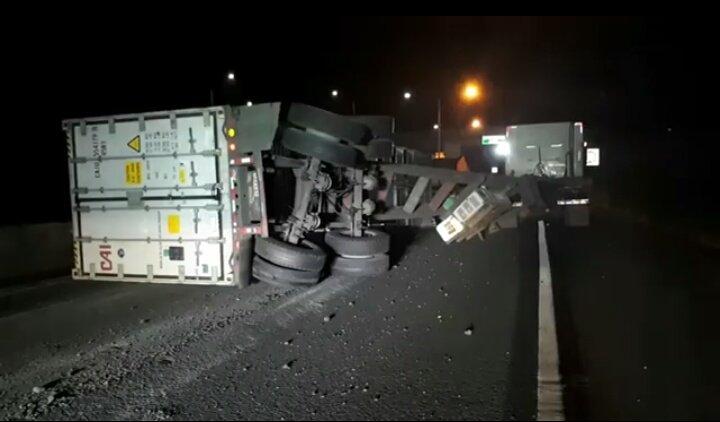 Panamá- Un camión contenedor repleto de “langostinos” se volcó y cayó sobre un taxi en la autopista Panamá Colón km 55, a altura de Quebrada López.