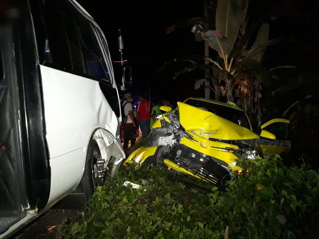 Tras la colisión el vehículo de transporte selectivo (taxi) este se salió de la vía quedando en medio de un herbazal y unas plantaciones de plátano , donde no se registraron víctima en este vehículo.
