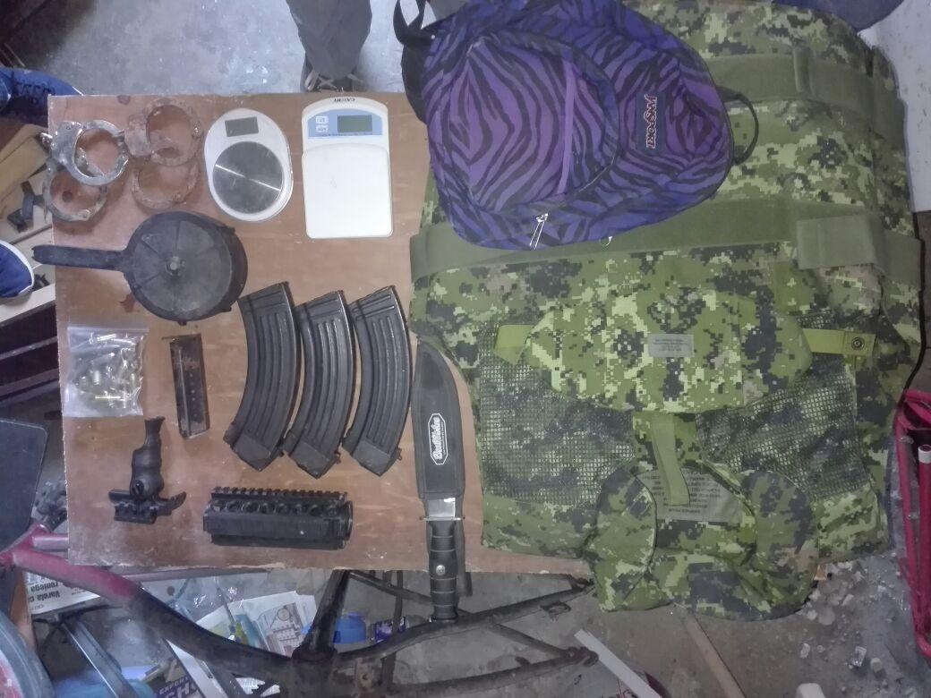 Decomisan varios proveedores, sustancias ilícitas, pesas digitales, arma blanca, esposas y un chaleco táctico durante una operación policial.