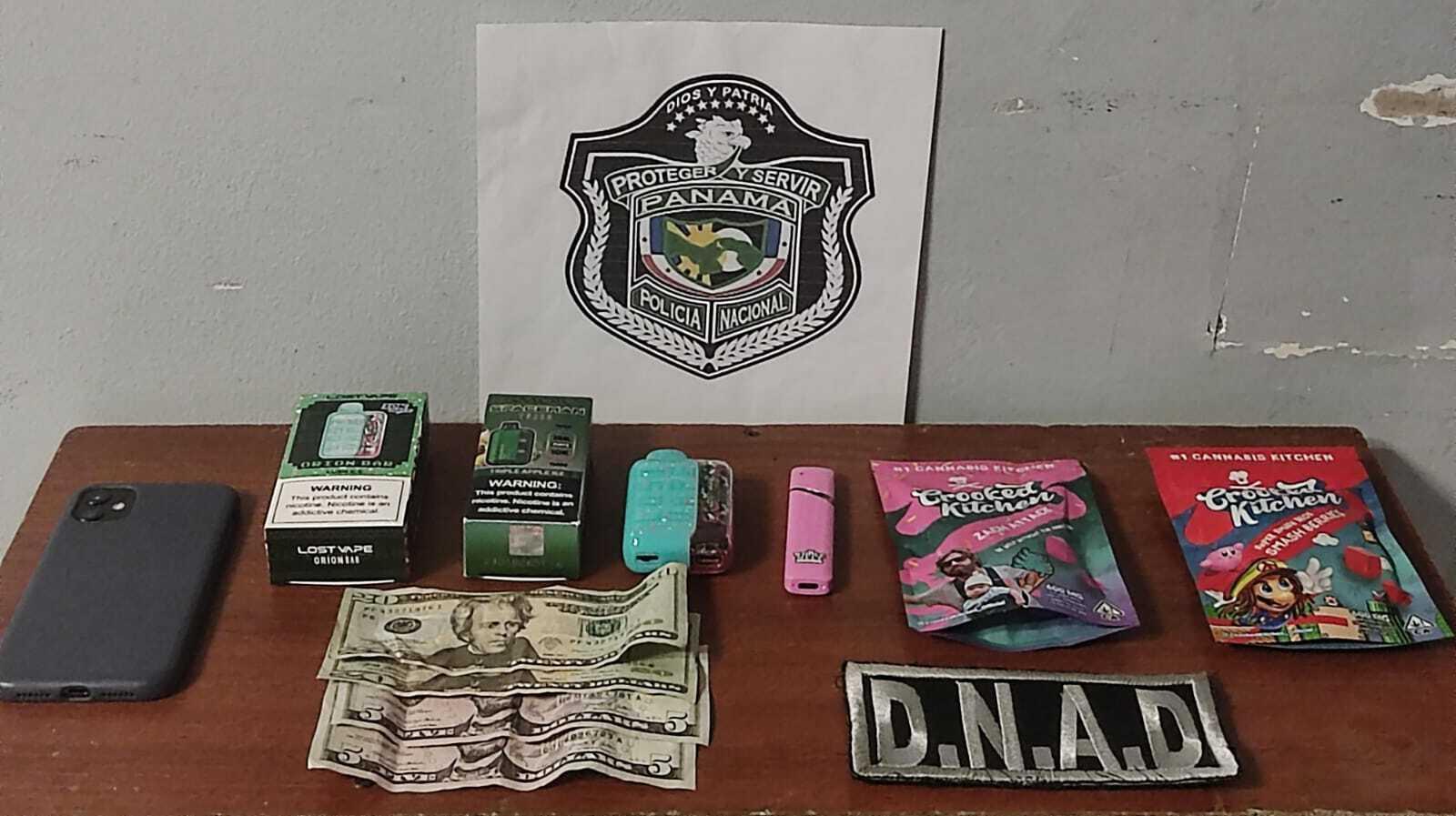 Durante la inspección, se le confiscó dos sobres con presunta droga, así como dos cigarrillos electrónicos sospechosos de contener THC, una suma de dinero en efectivo y un teléfono celular.