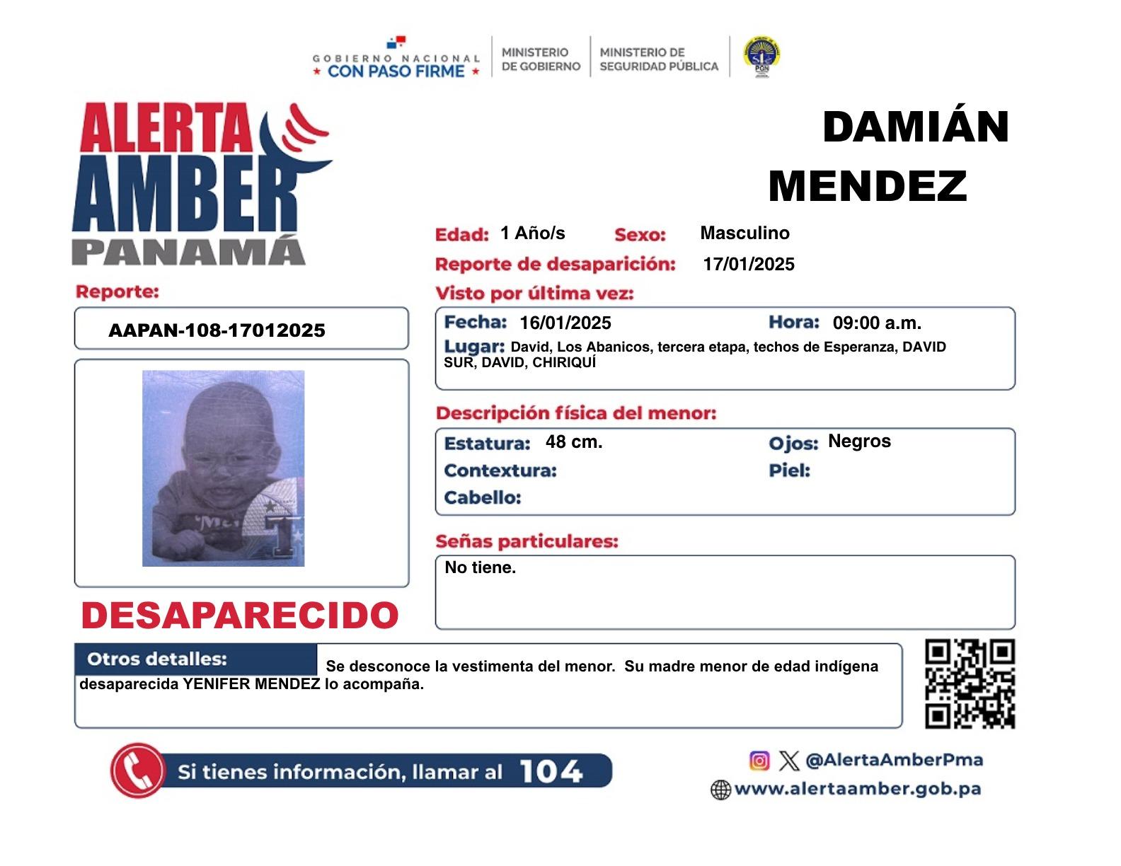 El menor, que mide 48 cm y tiene ojos negros, fue acompañado en su desaparición por su madre, una joven de etnia indígena, Yenifer Méndez, quien también se encuentra desaparecida.