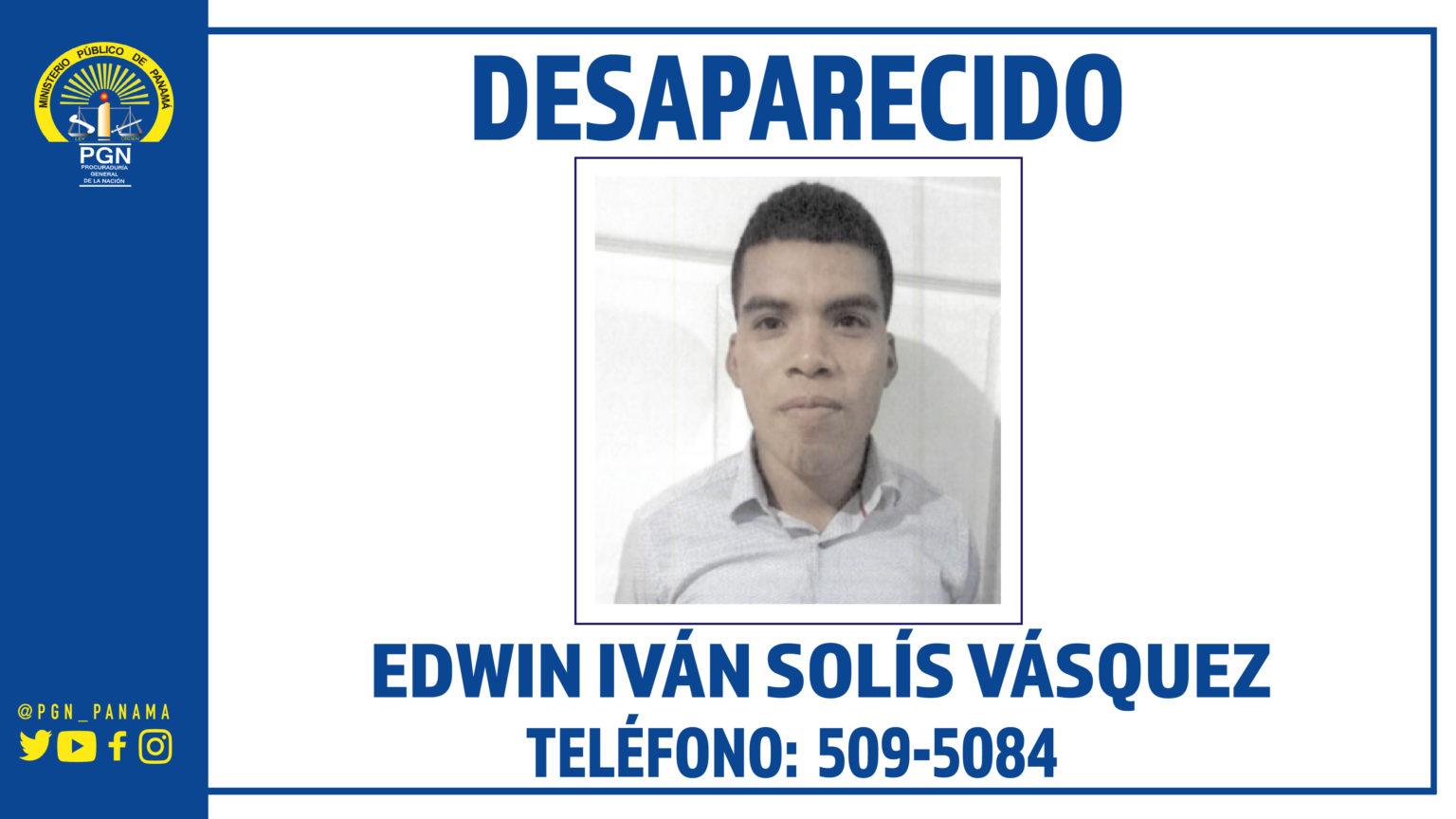 La Sección de Atención Primaria de la Fiscalía Regional de Panamá Oeste pide colaboración de la ciudadanía para dar con el paradero de Edwin Iván Solís Vásquez, de 26 años, quien se encuentra desaparecido desde el 5 de febrero de 2022.