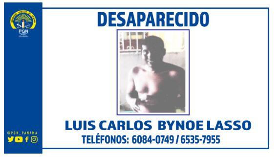 De acuerdo a familiares de Luis Carlos Bynoe Lasso, la última vez que fue visto fue en su residencia ubicada en la barriada El Palmar, distrito de Arraiján. Vestía jeans largo claro, suéter celeste y zapatillas rojas con blanco.