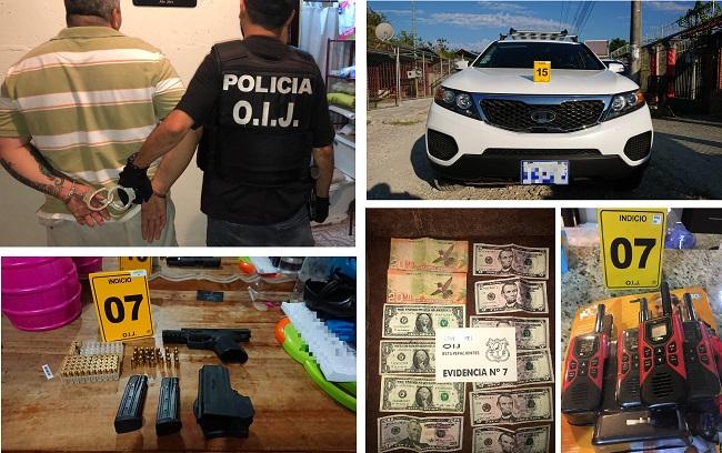 Los operativos se realizaron en ocho allanamientos en Golfito y uno en Belén de Heredia, donde se decomisaron dos pistolas, un revólver, dos escopetas y un rifle. Además, se ha incautado más de un millón de colones en efectivo, siete vehículos, teléfonos celulares, radios para comunicación y munición para arma de fuego calibre 9 milímetros, 357 y calibre 12.