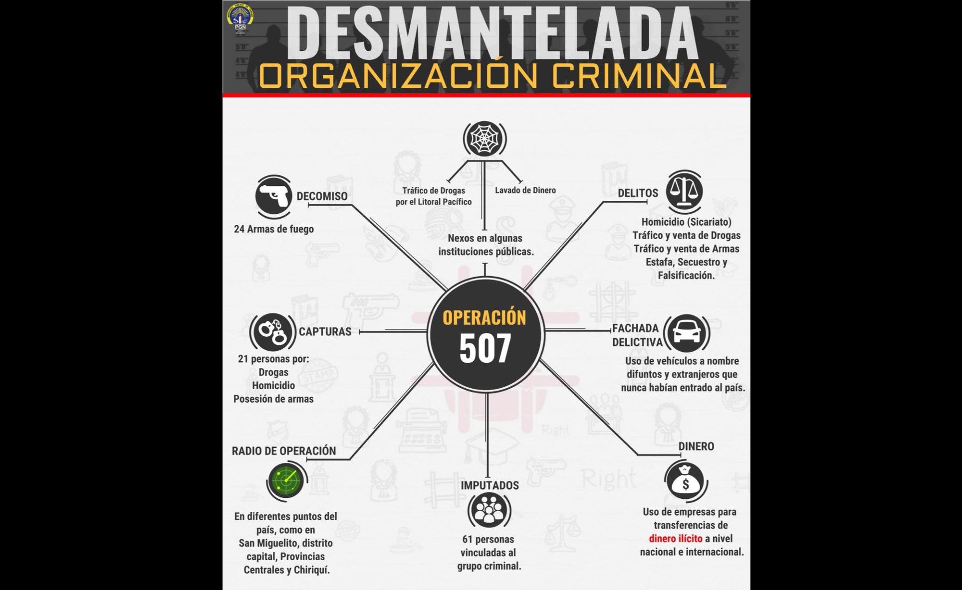 A través de la Operación 507, el Ministerio Público en conjunto con la Policía Nacional desmanteló una agrupación criminal que se dedicaba al sicariato, estafa, secuestro, falsificación, tráfico de armas y drogas en diferentes puntos del país.
