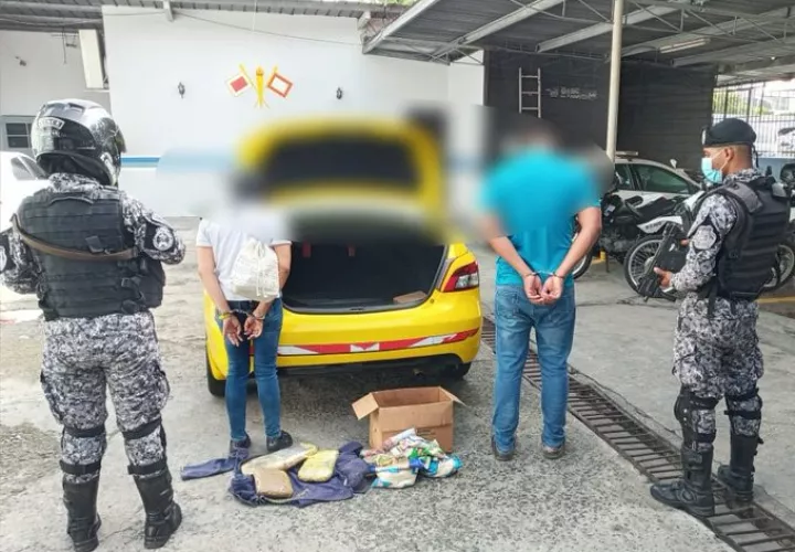 La información emitida por la Policía Nacional destaca que los sujetos iban a bordo de un taxi y que la mercancía ilícita estaba oculta en una cajeta con alimentos en el maletero.