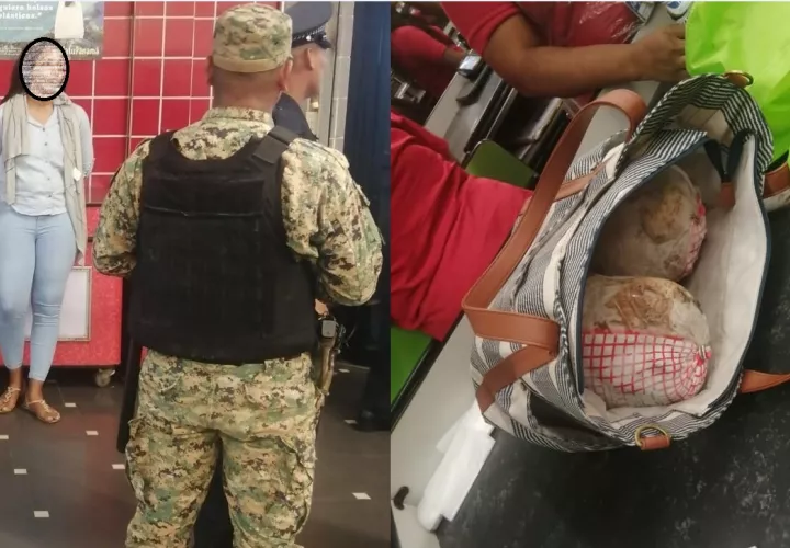 En imágenes de un video se muestra a unidades de la Policía Nacional junto a la mujer, luego de haberse sido abordada y el paquete donde se encontraban los jamones picnic.