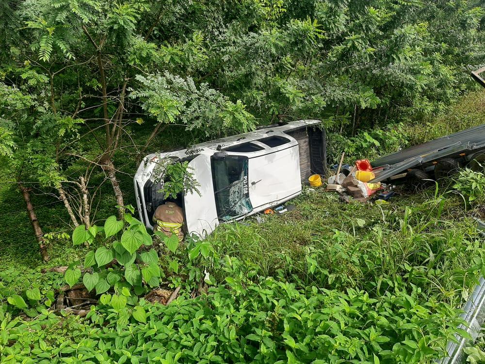 Pérez informó que a eso de las nueve de la mañana del pasado viernes, se dio la colisión y vuelco de dos vehículos, un sedan y otro tipo pickup, perteneciente a una empresa constructora, que a su vez  transportaba un remolque con vallas de seguridad.
