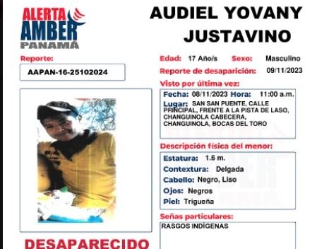 Las autoridades en Bocas del Toro están en alerta máxima por la desaparición de Audiel Yovany Justavino, un joven de 17 años visto por última vez el pasado 8 de noviembre en San San Puente, Changuinola.
