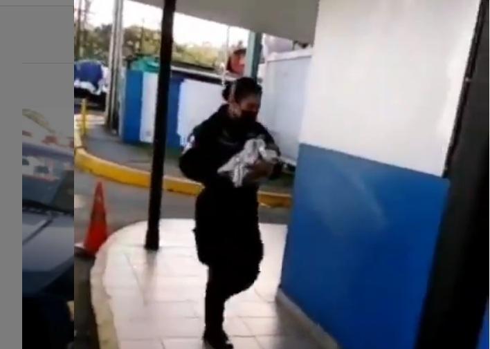 En un video posteado por la Policía Nacional se observa el momento en que la cabo Ruiz llega a la Policlínica de Sabanitas con el menor en brazos, que estaba cubierto con una manta celeste.