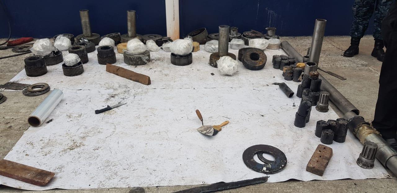 Los fronterizos, por más de un día, lograron sacar con soldadura, y cortadora de metal, 20 paquetes de droga embalados con cinta oscura dentro de los engranajes, y 35 paquetes dentro de cilindros.