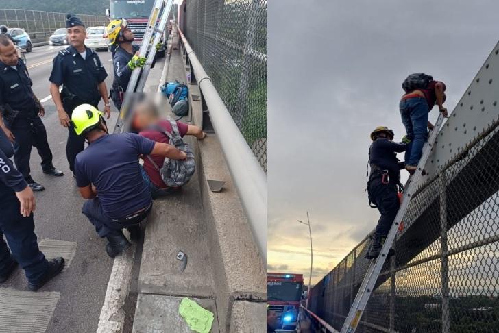 Después de varios minutos de diálogo, el hombre aceptó bajar de las vigas del puente, y fue puesto a salvo sin que una sola gota de violencia tocara la escena.