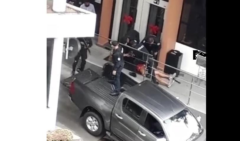 En imágenes de videos que circulan en redes se observa a un hombre que mantiene a otro sometido en el suelo, a las puertas del banco. Alrededor de la sucursal al momento del intento de atraco, policías rodearon el área.