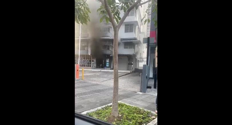 Personas que circulan y laboran en negocios ubicados en ese sector, se detuvieron a ver qué ocurría al observar el humo negro que emana de la puerta frontal de un local del edificio.
