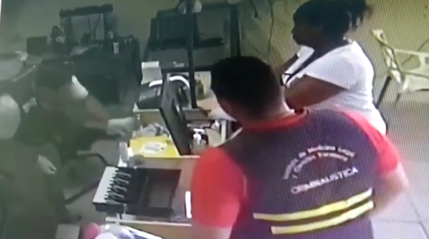 Parte del video muestra a tres funcionarios de criminalística dentro del local, uno de los cuales revisa bajo el mostrador y del cual, según indica el dueño del comercio, extrae parte del dinero contenido en una caja de color blanco.