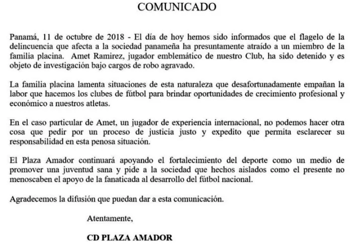 El Club Plaza Amador lamentó la situación que enfrenta el futbolista que forma parte de este grupo deportivo.