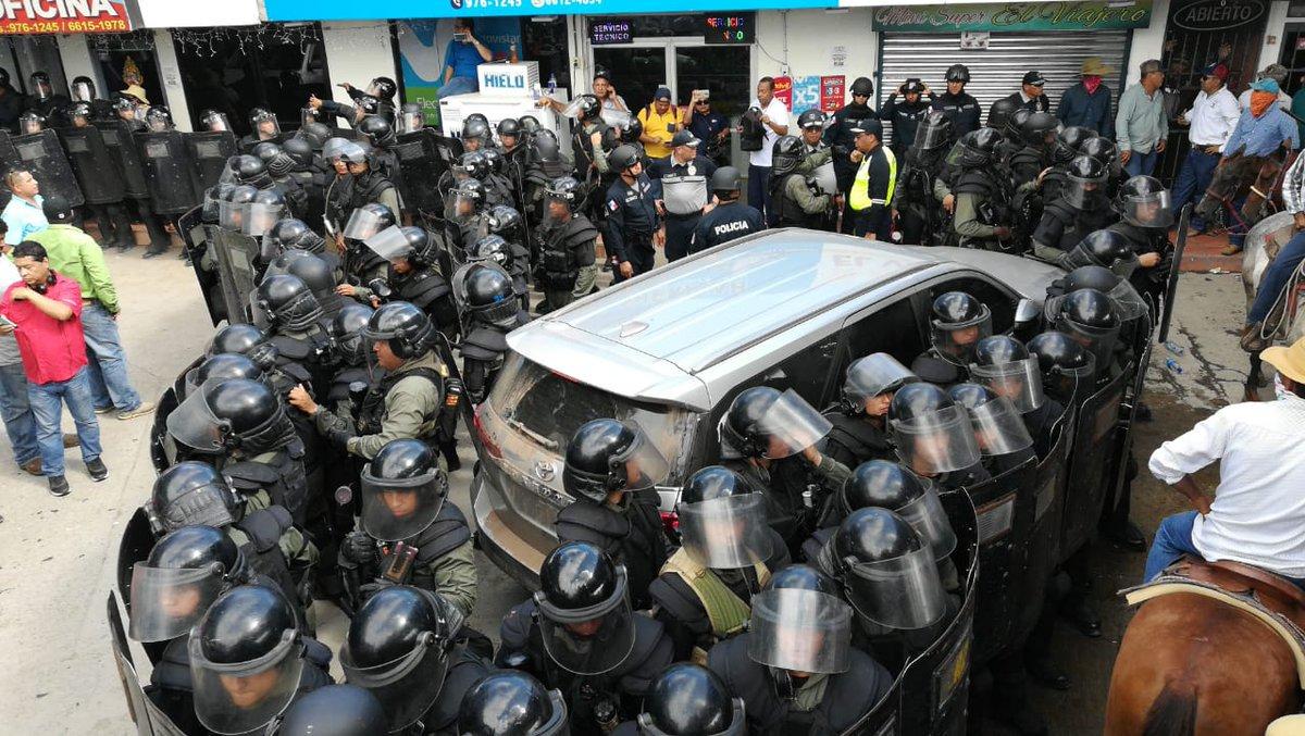 Los uniformados tuvieron que crear un cerco para abrir paso en medio de los manifestantes y así poder que el auto se retirara del lugar