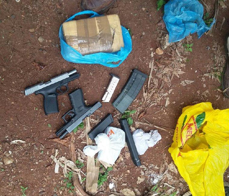 Dos pistolas 9 milímetros y tres cargadores, además de un paquete con marihuana, fue el hallazgo de un caleto, por las unidades de la Dirección Nacional de Inteligencia Policial en Rana de oro, del corregimiento Pedregal.