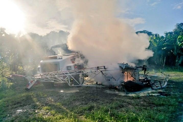 Un helicóptero de fumigación colisionó con un camión de combustible, cuando su piloto se disponía a aterrizar la aeronave, a primeras horas de la mañana de este domingo.