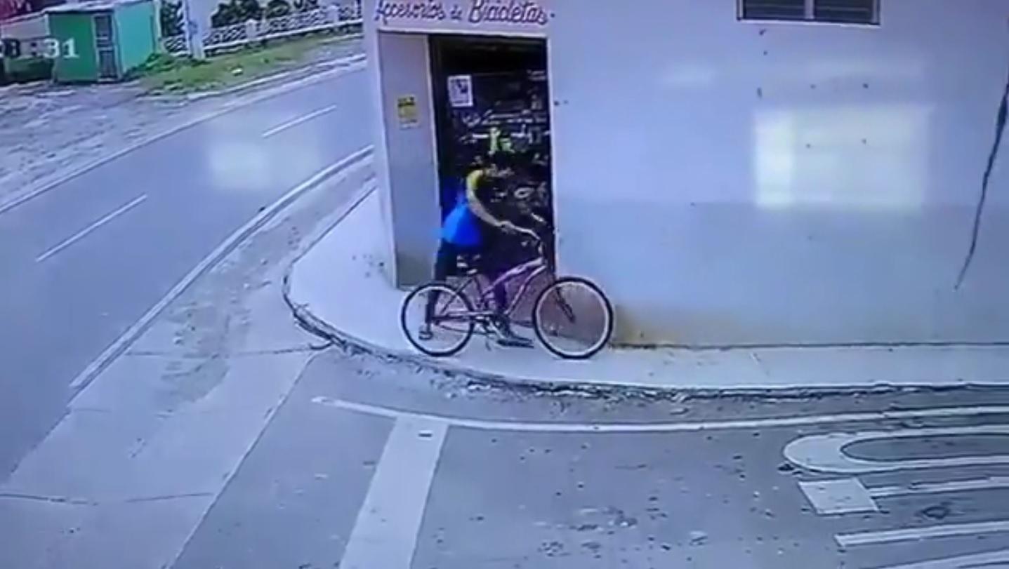 En las imágenes se aprecia que la bicicleta estaba estacionada en la acera de la vía justo en frente de la puerta de un local comercial, mientras que la calle permanece casi solitaria.