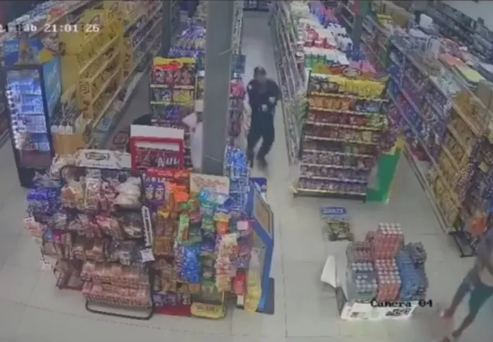 Las cámaras de seguridad captaron el momento en que los maleantes, pistola en mano, ingresan al comercio y amenazan a los clientes, pero apareció el héroe de la noche y los sorprendió desde la parte trasera del negocio y, sin pensarlo dos veces, desenfundó su arma reglamento y disparó contra los maleantes quienes salieron corriendo del local como alma que lleva el diablo, dejando botada en la entrada el arma que llevaban para perpetrar este asalto frustrado.