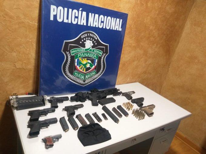 El subcomisionado César Zambrano, jefe de la zona policial de Panamá Oeste, detalló que en la acción operativa se incautó en el auto 8 pistolas calibre 9 mm, un fusil M4 arma de guerra y un pasamontañas.