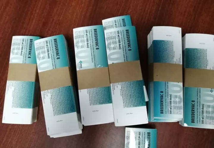 Se encontraron mil 700 etiquetas del fármaco Breedervac 8 de 500 ml, 850 empaques para el medicamento Cobactan de uso veterinario.
