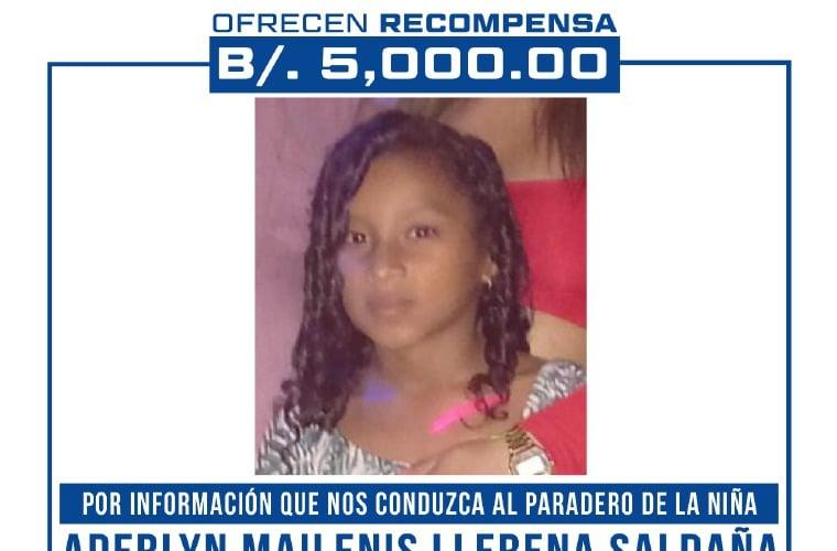 Hay una recompensa de $5,000 por el paradero de Aderlyn. El comisionado César Villar, del Senafront, dijo que se unió a la búsqueda de la niña y revisan los autos que circulan hacia el área de Chiriquí y la frontera con Costa Rica.
