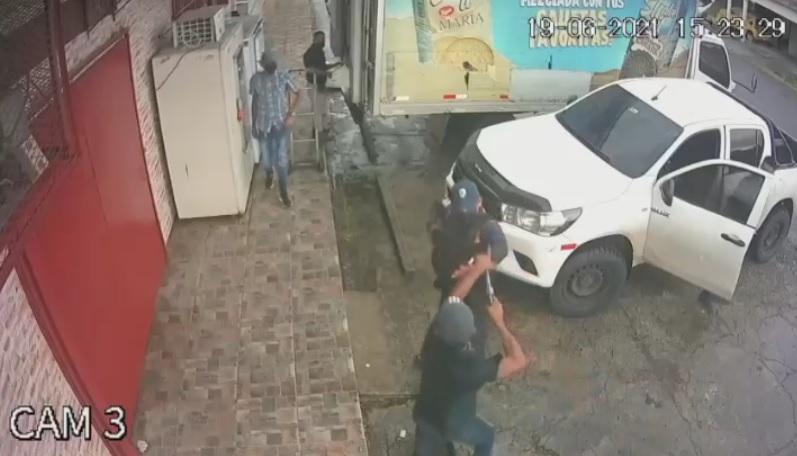 Una cámara de seguridad dejó grabado el momento en el que delincuentes intentan robar arma a un seguridad que custodiaba un carro repartido cuando este realizaba una entrega en el Minisuper Wan#4, ubicado en la Barriada San José, en Villa Grecia.
