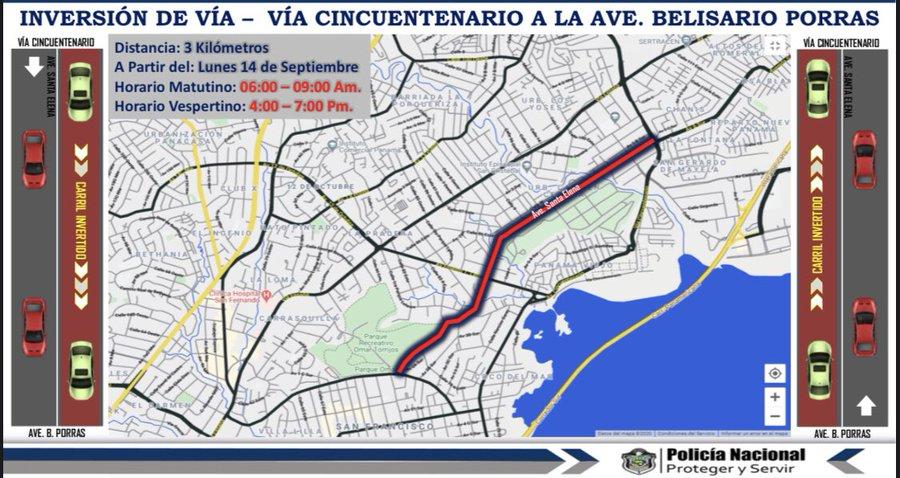 A partir del próximo lunes, 14 de septiembre, iniciará el operativo de inversión de carriles en la Vía Centenario (Santa Elena) hacia la Avenida Belisario Porras (vía Porras), a partir de las 6:00 a.m. a 9:00 a.m. con sentido a la ciudad. En la tarde será desde las 4:00 p.m. a 7:00 p.m. hacia las afueras.