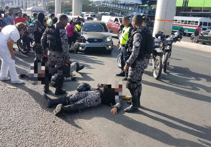 Los uniformados terminaron tirados en el pavimento con heridas, luego del accidente en el que se vio involucrado un auto, tipo sedán.
