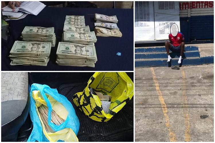 Unidades de la Policía Nacional encontraron dos bolsas de plástico con cerca de 50 mil dólares en efectivo, dentro del auto en el que se transportaba el hombre de aproximadamente 50 años.