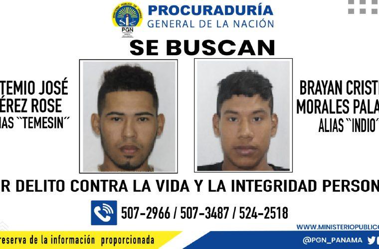 La Sección de Homicidio y Femicidio de la Fiscalía Metropolitana, solicita la colaboración de la ciudadanía para dar con el paradero de Artemio José Pérez alías “Temesin” y Brayan Cristian Morales Palacios, alias “Indio”, requeridos mediante orden de aprehensión dentro de la investigación por los delitos Contra la Vida y la Integridad Personal, homicidio doloso, en perjuicio de Josué Joel Torres Marquínez y homicidio en grado de tentativa en perjuicio de Emilo Javier Vergara Tuñón, hecho ocurrido en el corregimiento de Calidonia, el 20 de febrero de 2022.