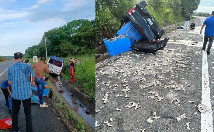 Producto del fuerte impacto, el bus de pasajeros se salió de la vía y quedó metido en una cuneta, además, el pick up con los mariscos se volcó y soltó toda la carga en la calle.