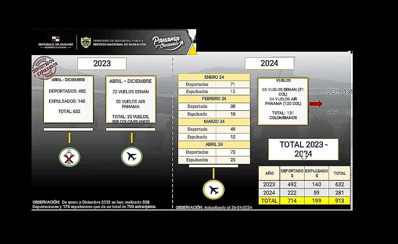 El Servicio Nacional de Migración de Panamá ha revelado que se han llevado a cabo un total de 714 deportaciones y 199 expulsiones desde que inició la Operación Ecudo iniciada en abril del 2023.