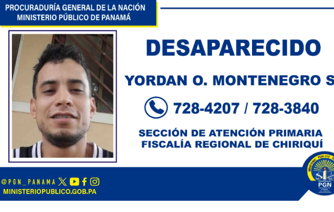 La Procuraduría General de la Nación (PGN), mediante comunicado de prensa, solicitó a la población información para dar con el paradero del ciudadano Yordan Oscar Montenegro Saldaña, de 33 años, quien desapareció desde el mes de febrero.
